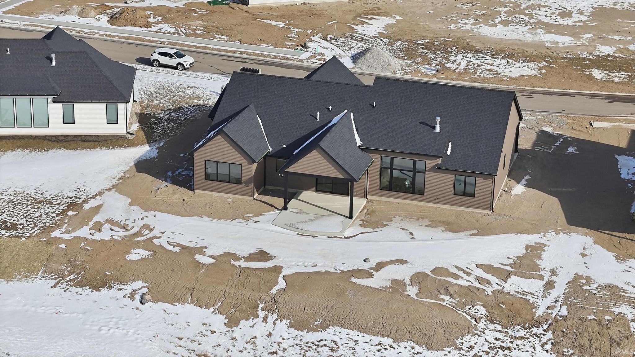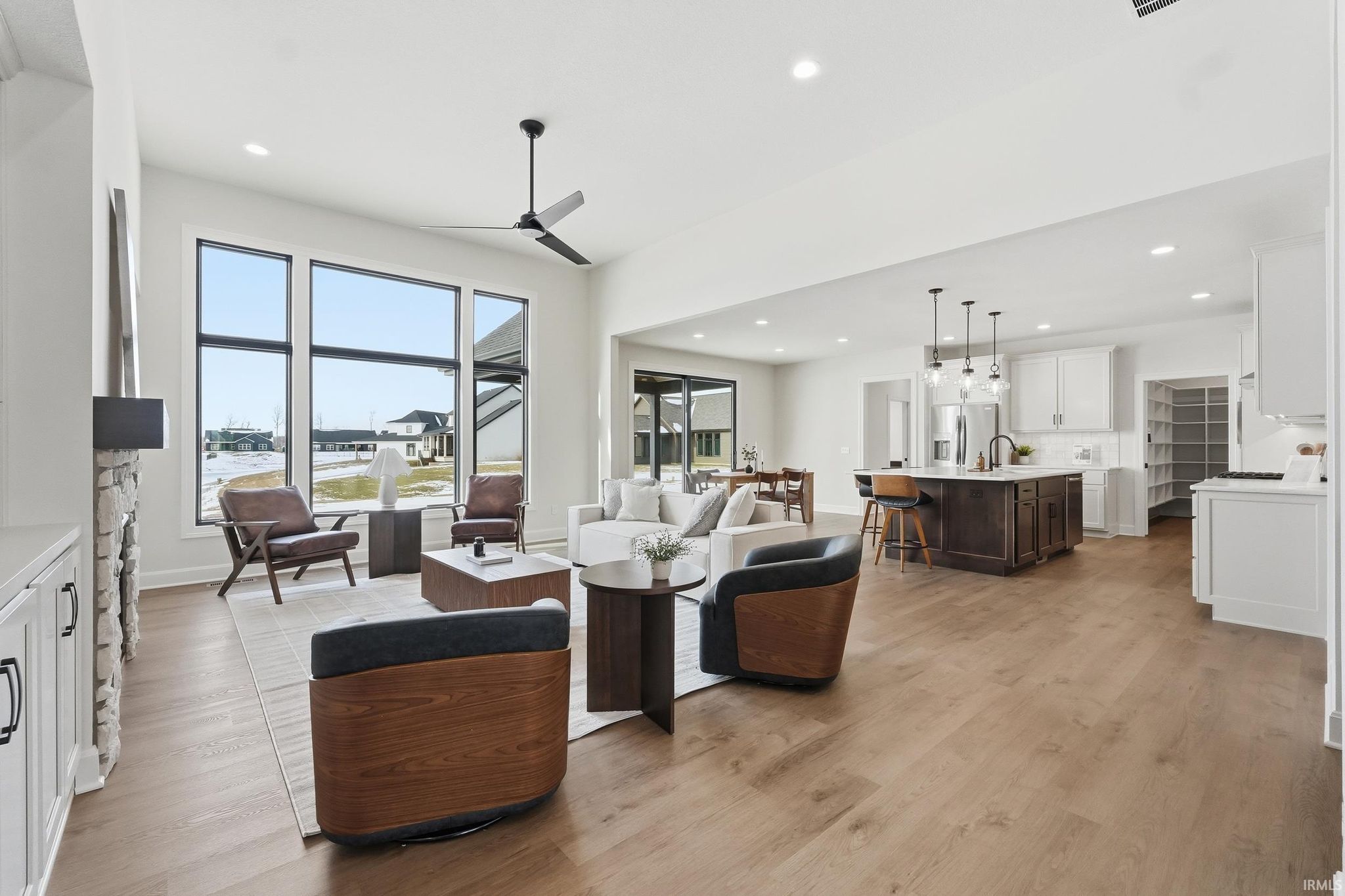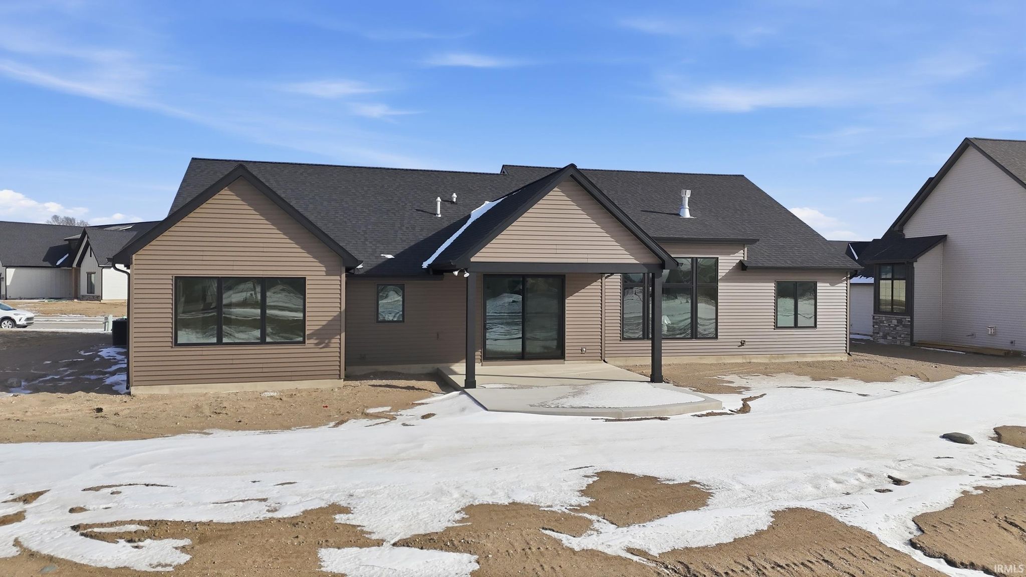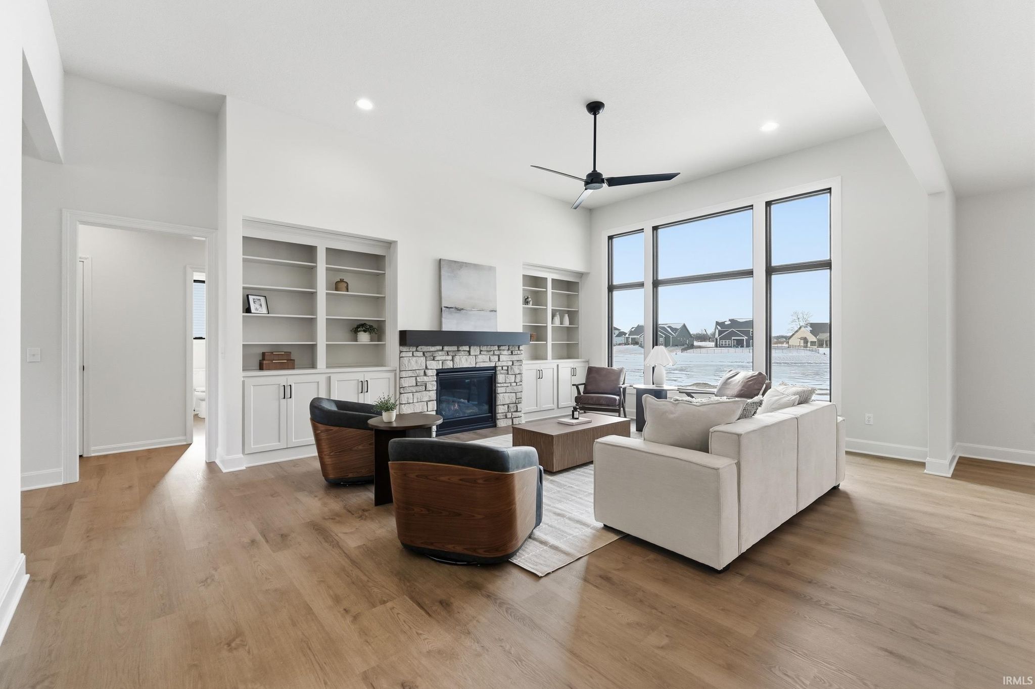Brand-new custom ranch by Bob Buescher Homes, thoughtfully designed and meticulously crafted with 2,237 sq. ft. of beautifully finished living space. This single-story home offers 3 bedrooms, 2.5 baths, a private office with closet, and an expansive 816 sq. ft. 3-car garage. The exterior showcases timeless curb appeal with an oversized front porch, elegant double entry doors, a striking dormer, and a rear covered porch featuring a soaring cathedral ceiling and extended patio—perfect for relaxing or entertaining. Inside, the open-concept layout is warm, inviting, and filled with natural light. The great room features 11’ ceilings with decorative beams, a stunning fireplace flanked by custom built-ins, and large windows that capture picturesque water views. The adjoining kitchen and dining area are both stylish and functional, highlighted by custom cream-finished maple cabinetry, an 8x5 hickory island with a rich coffee-bean stain, and a spacious walk-in pantry with a built-in coffee bar. LG Clarino Brushed Quartz countertops grace both the kitchen perimeter and island, creating a true focal point for the home. The primary bedroom suite is a private retreat with a cathedral ceiling and spa-inspired bath featuring a zero-entry custom tiled shower, dual quartz vanity, linen cabinet, and an oversized walk-in closet. A transom window above the vanity brings in natural light and enhances the serene atmosphere. Bedrooms two and three are generously sized and located on the opposite side of the home, sharing a well-appointed full bath. Additional highlights include a conveniently located laundry room adjacent to the primary suite, a stylish half bath, a custom built-in bench with hooks near the garage entry, and a dedicated office/den just off the foyer with a glass door for added privacy and elegance. The home is equipped with a tankless water heater, full irrigation system, and access to nearby scenic walking trails. Final grading and seeding will be completed in the spring, when weather permits. A perfect blend of quality craftsmanship, modern design, and everyday functionality—this home truly delivers comfort and elegance in every detail.