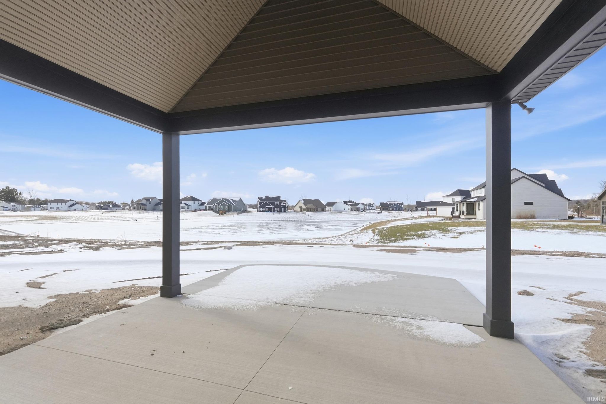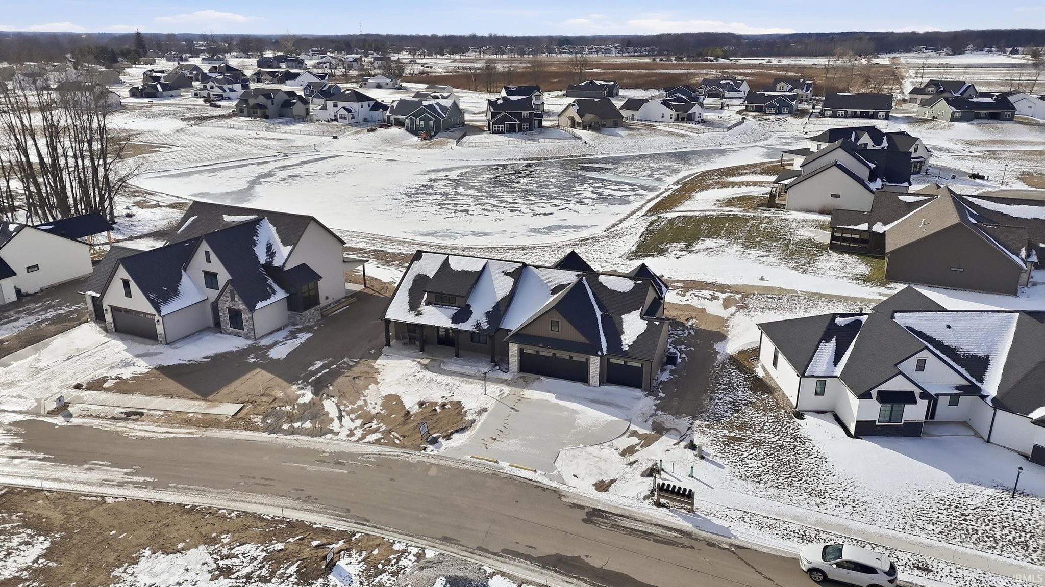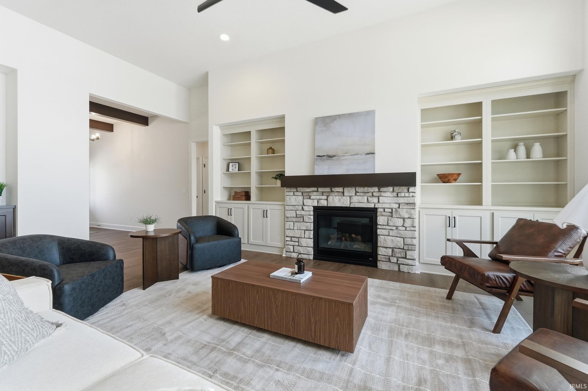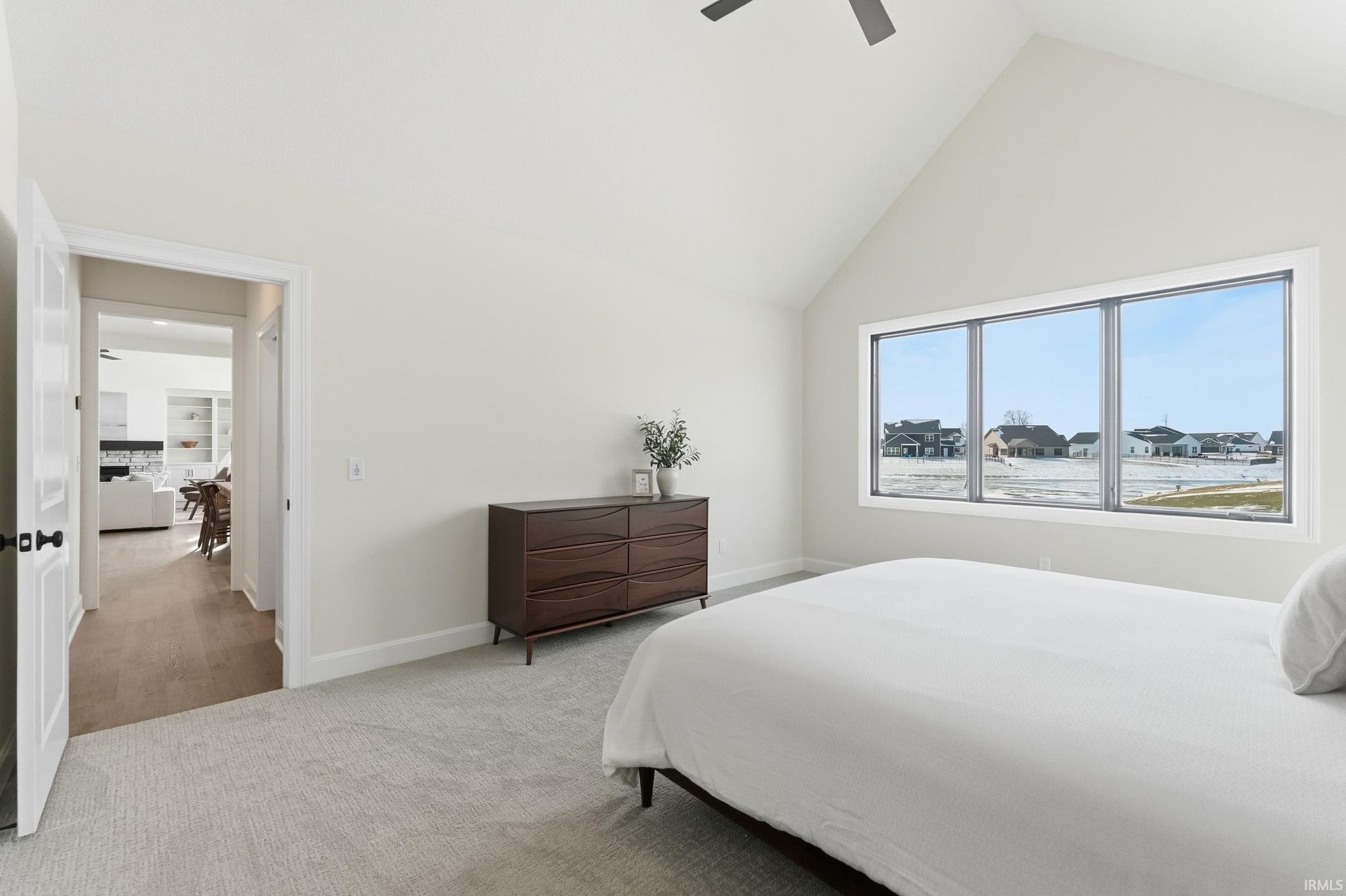 Brand-new custom ranch by Bob Buescher Homes, thoughtfully designed and meticulously crafted with 2,237 sq. ft. of beautifully finished living space. This single-story home offers 3 bedrooms, 2.5 baths, a private office with closet, and an expansive 816 sq. ft. 3-car garage. The exterior showcases timeless curb appeal with an oversized front porch, elegant double entry doors, a striking dormer, and a rear covered porch featuring a soaring cathedral ceiling and extended patio—perfect for relaxing or entertaining. Inside, the open-concept layout is warm, inviting, and filled with natural light. The great room features 11’ ceilings with decorative beams, a stunning fireplace flanked by custom built-ins, and large windows that capture picturesque water views. The adjoining kitchen and dining area are both stylish and functional, highlighted by custom cream-finished maple cabinetry, an 8x5 hickory island with a rich coffee-bean stain, and a spacious walk-in pantry with a built-in coffee bar. LG Clarino Brushed Quartz countertops grace both the kitchen perimeter and island, creating a true focal point for the home. The primary bedroom suite is a private retreat with a cathedral ceiling and spa-inspired bath featuring a zero-entry custom tiled shower, dual quartz vanity, linen cabinet, and an oversized walk-in closet. A transom window above the vanity brings in natural light and enhances the serene atmosphere. Bedrooms two and three are generously sized and located on the opposite side of the home, sharing a well-appointed full bath. Additional highlights include a conveniently located laundry room adjacent to the primary suite, a stylish half bath, a custom built-in bench with hooks near the garage entry, and a dedicated office/den just off the foyer with a glass door for added privacy and elegance. The home is equipped with a tankless water heater, full irrigation system, and access to nearby scenic walking trails. Final grading and seeding will be completed in the spring, when weather permits. A perfect blend of quality craftsmanship, modern design, and everyday functionality—this home truly delivers comfort and elegance in every detail.