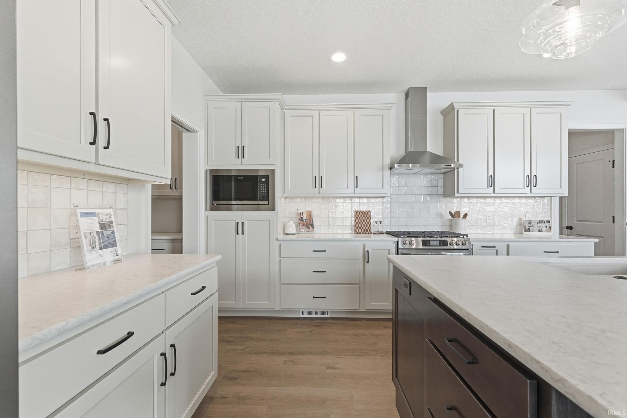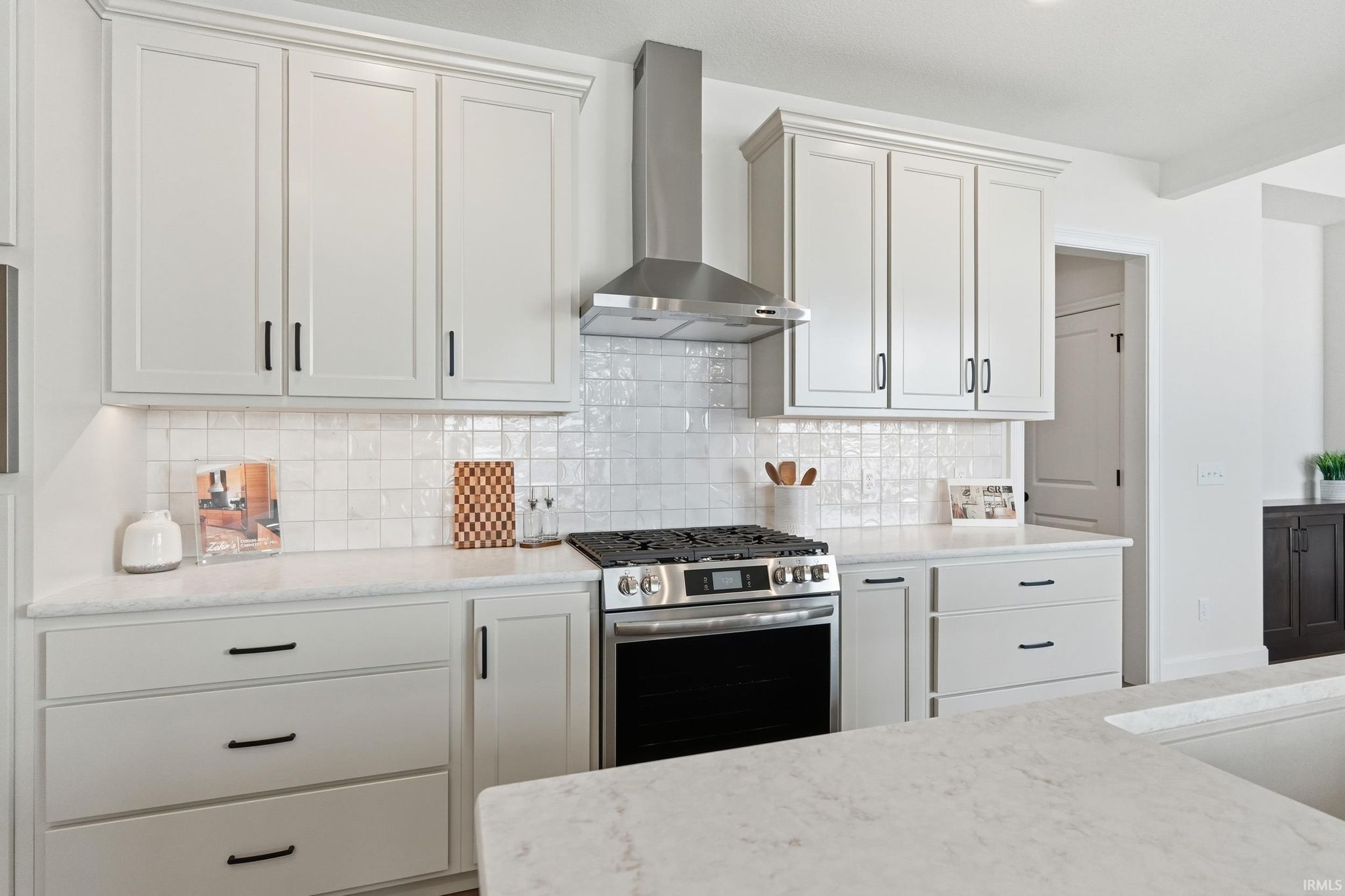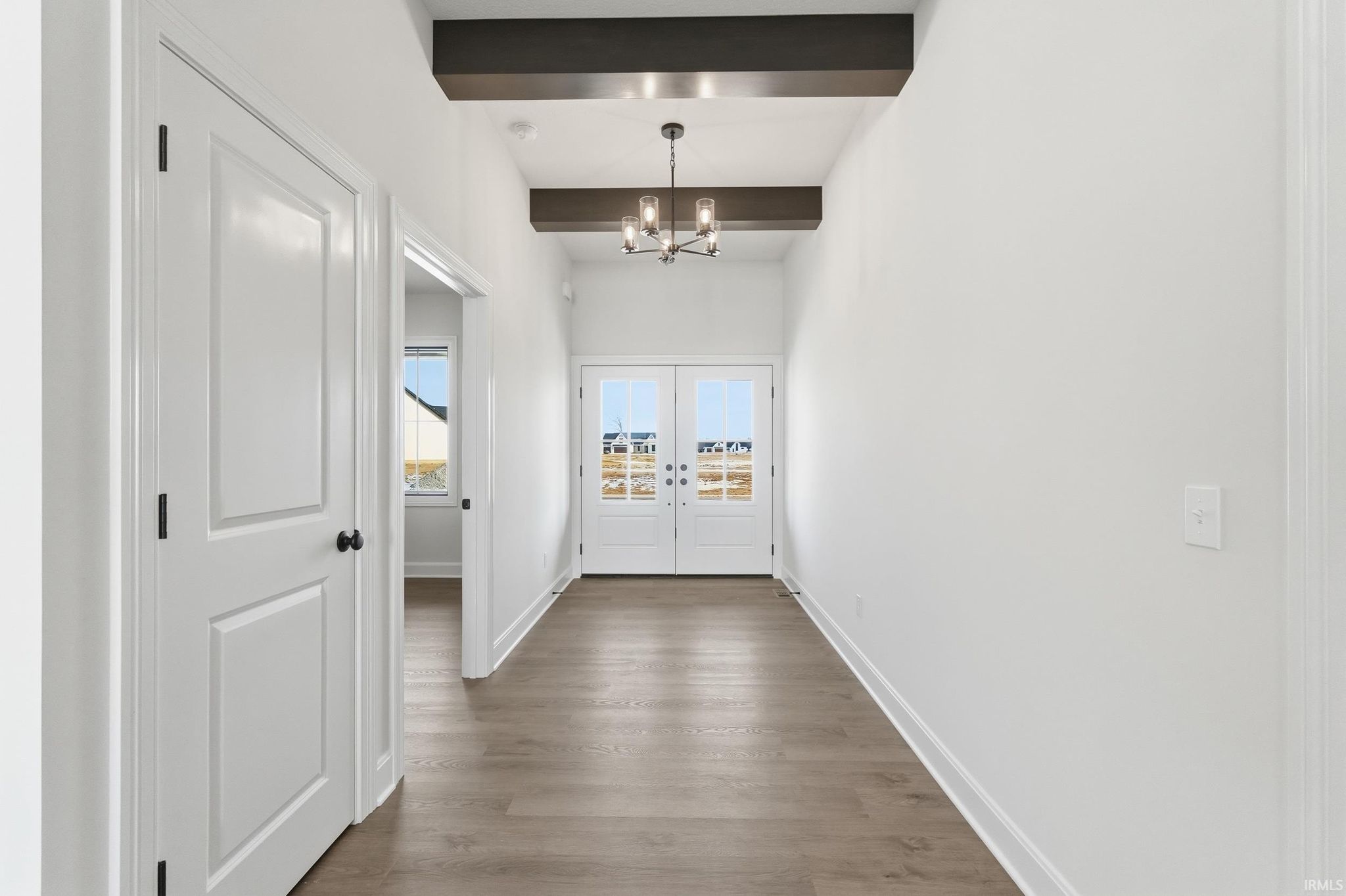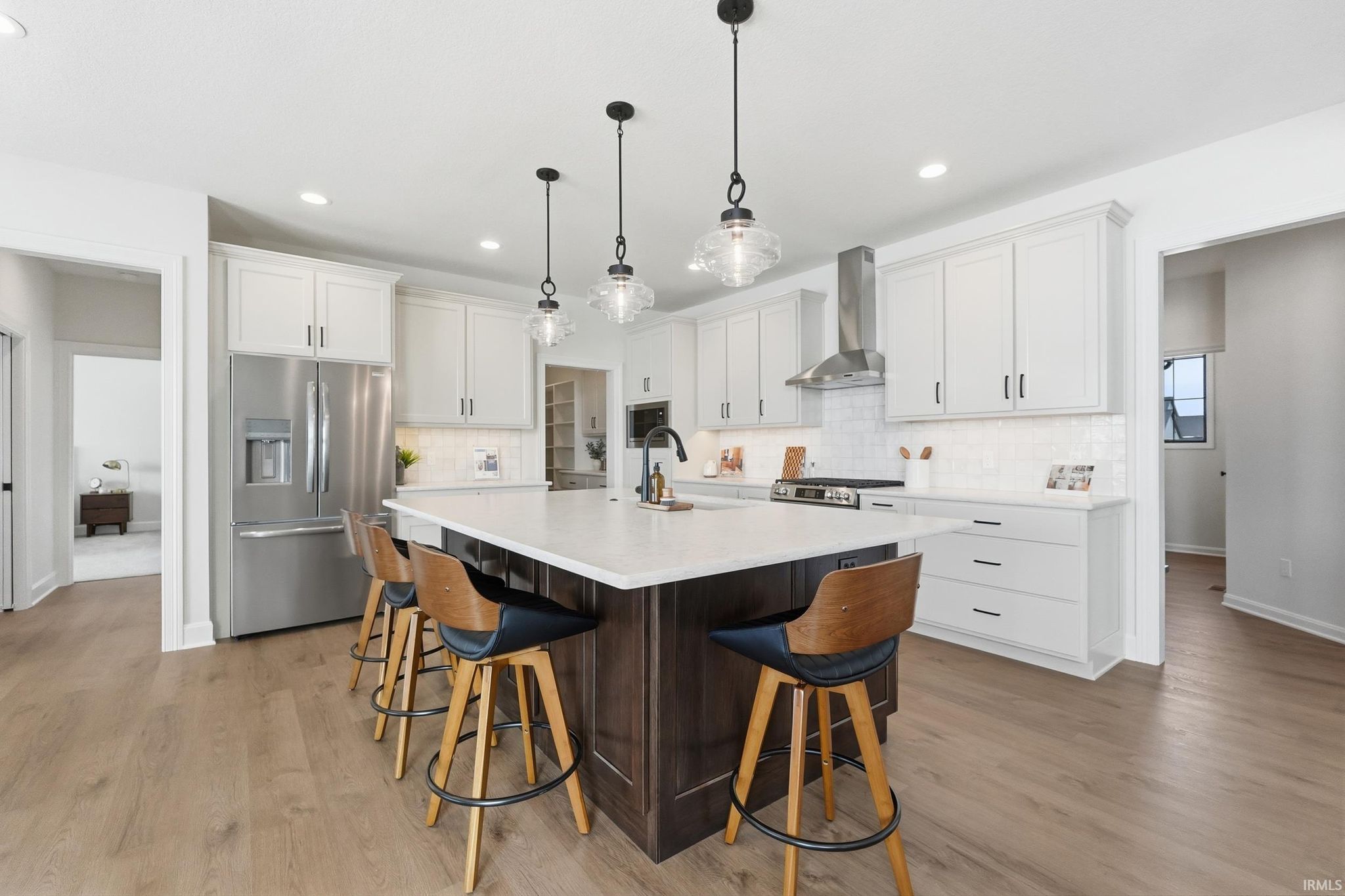 Brand-new custom ranch by Bob Buescher Homes, thoughtfully designed and meticulously crafted with 2,237 sq. ft. of beautifully finished living space. This single-story home offers 3 bedrooms, 2.5 baths, a private office with closet, and an expansive 816 sq. ft. 3-car garage. The exterior showcases timeless curb appeal with an oversized front porch, elegant double entry doors, a striking dormer, and a rear covered porch featuring a soaring cathedral ceiling and extended patio—perfect for relaxing or entertaining. Inside, the open-concept layout is warm, inviting, and filled with natural light. The great room features 11’ ceilings with decorative beams, a stunning fireplace flanked by custom built-ins, and large windows that capture picturesque water views. The adjoining kitchen and dining area are both stylish and functional, highlighted by custom cream-finished maple cabinetry, an 8x5 hickory island with a rich coffee-bean stain, and a spacious walk-in pantry with a built-in coffee bar. LG Clarino Brushed Quartz countertops grace both the kitchen perimeter and island, creating a true focal point for the home. The primary bedroom suite is a private retreat with a cathedral ceiling and spa-inspired bath featuring a zero-entry custom tiled shower, dual quartz vanity, linen cabinet, and an oversized walk-in closet. A transom window above the vanity brings in natural light and enhances the serene atmosphere. Bedrooms two and three are generously sized and located on the opposite side of the home, sharing a well-appointed full bath. Additional highlights include a conveniently located laundry room adjacent to the primary suite, a stylish half bath, a custom built-in bench with hooks near the garage entry, and a dedicated office/den just off the foyer with a glass door for added privacy and elegance. The home is equipped with a tankless water heater, full irrigation system, and access to nearby scenic walking trails. Final grading and seeding will be completed in the spring, when weather permits. A perfect blend of quality craftsmanship, modern design, and everyday functionality—this home truly delivers comfort and elegance in every detail.