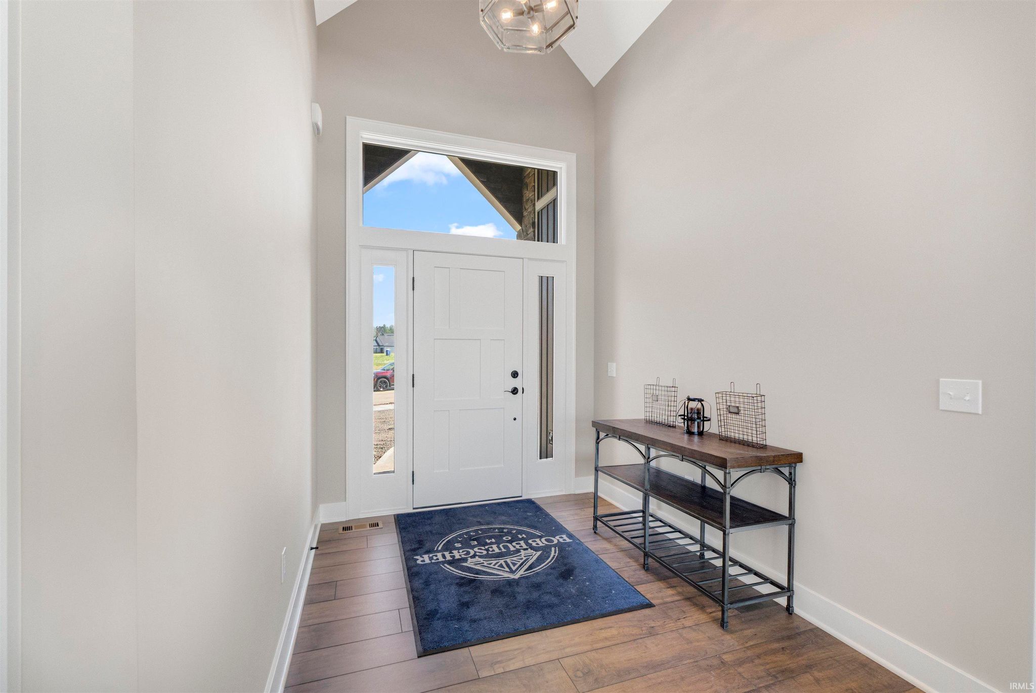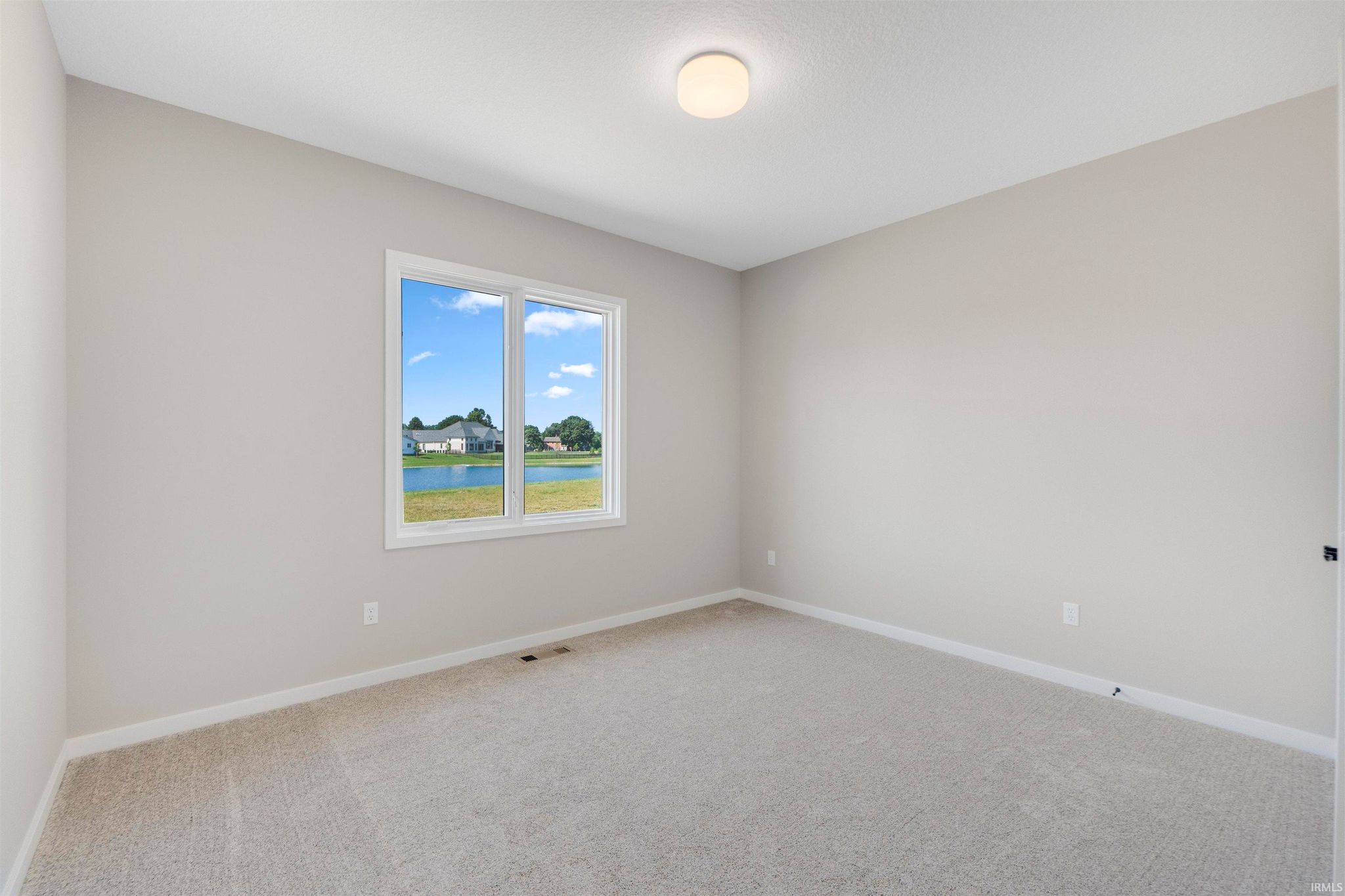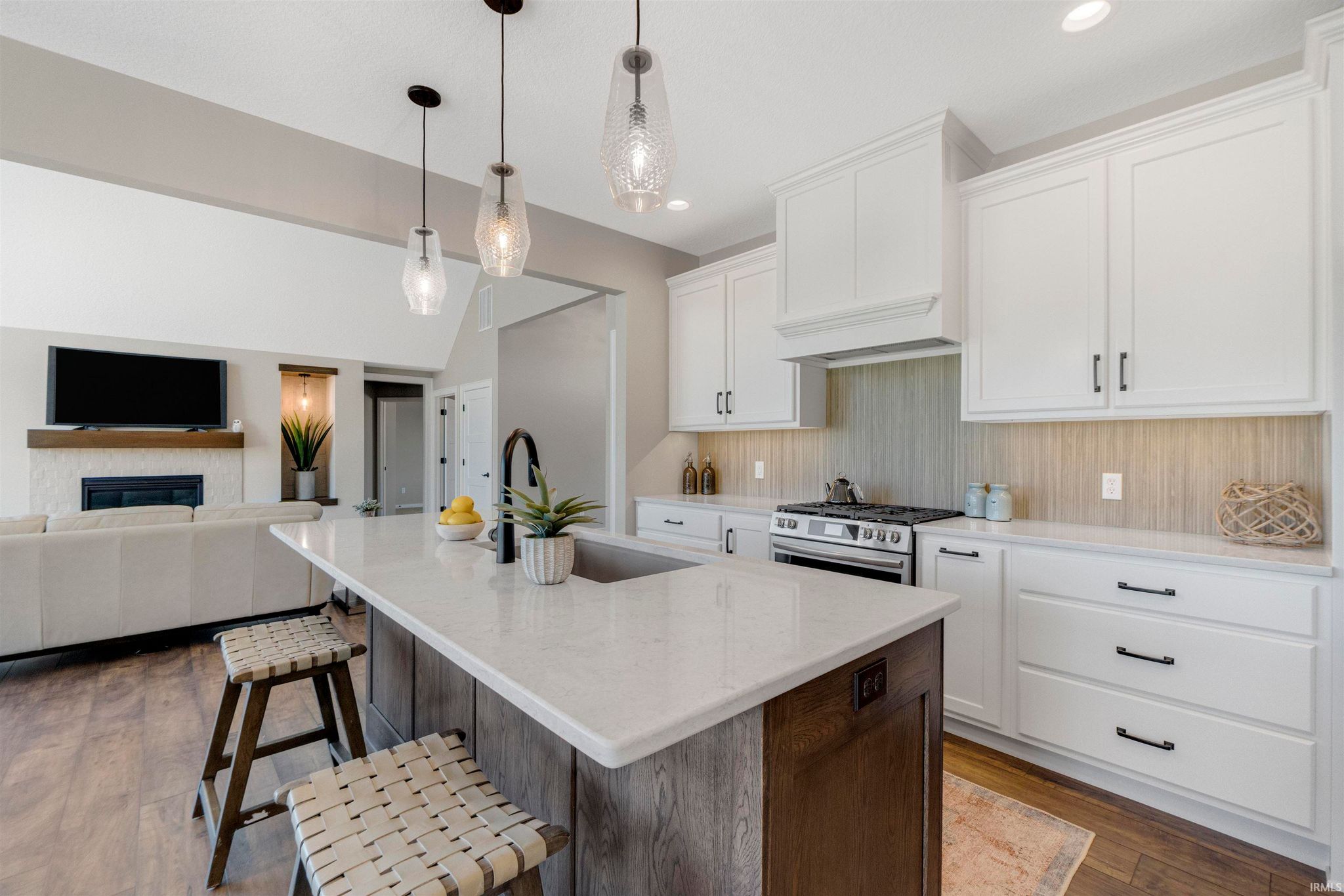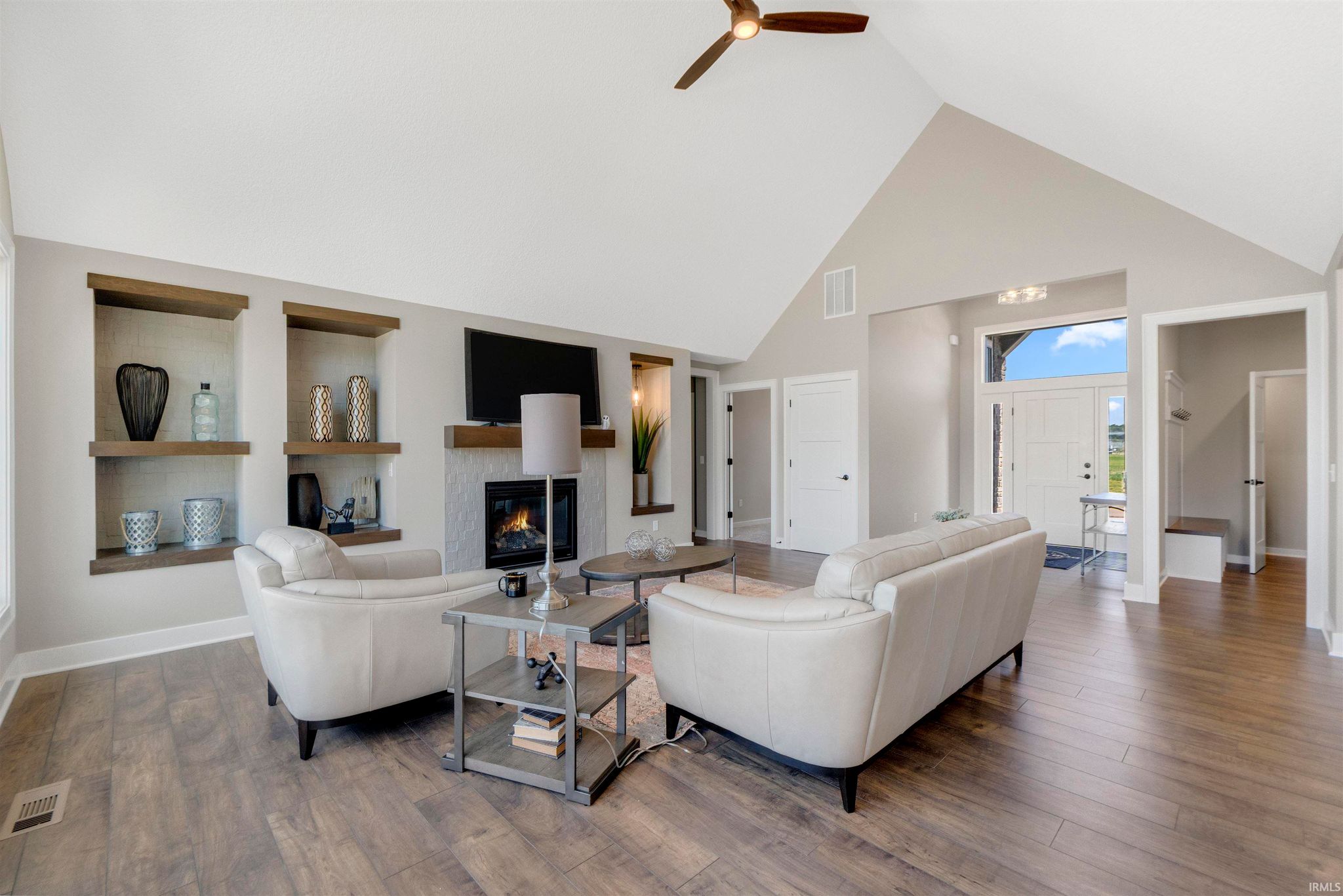 Water-View Ranch by Bob Buescher Homes | Completed 2024 | Warranties Begin at Closing. Experience the opportunity to own a completed ranch with scenic pond views in Cascata Estates by one of Fort Wayne’s most recognized custom builders. Built in 2024 and treated as new construction, this home includes builder warranties beginning at closing, offering the confidence and peace of mind. Thoughtfully positioned on Lot 62 with open sight-lines toward the neighborhood pond and fountain, this 2,032 square foot single-level design offers three bedrooms, 2.5 baths, a private den, and an oversized 971 square foot three-car garage. A soaring cathedral ceiling creates an immediate sense of openness while expansive windows frame tranquil water views and fill the great room with natural light. A gas fireplace with custom built-ins anchors the space with warmth and architectural presence. The open-concept layout flows seamlessly into a thoughtfully designed kitchen showcasing custom cabinetry, quartz countertops, a generous 3x8 island, gas range, full stainless appliance package, and an impressive walk-in pantry. The dining area overlooks the water and opens directly to a covered rear porch with additional patio space, ideal for morning coffee, evening sunsets, and effortless indoor-outdoor living. The private primary suite also enjoys pond views and features a spa-inspired bath with tiled walk-in shower, updated double vanity top that now matches the secondary full bath, linen storage, and a spacious walk-in closet with built-in shelving. Two additional bedrooms are thoughtfully positioned for privacy, while the dedicated den near the foyer offers flexibility for a home office or quiet retreat. A custom built-in bench and adjacent half bath just off the garage enhance everyday functionality. Irrigation, newly seeded lawn, builder orientation prior to closing, and immediate possession provide the benefit of new construction without the extended build timeline. Cascata Estates offers convenient access to walking trails, shopping, dining, Parkview Regional Medical Center, and I-69 within a desirable north Fort Wayne community. This completed water-view ranch is ready for its first owners.
