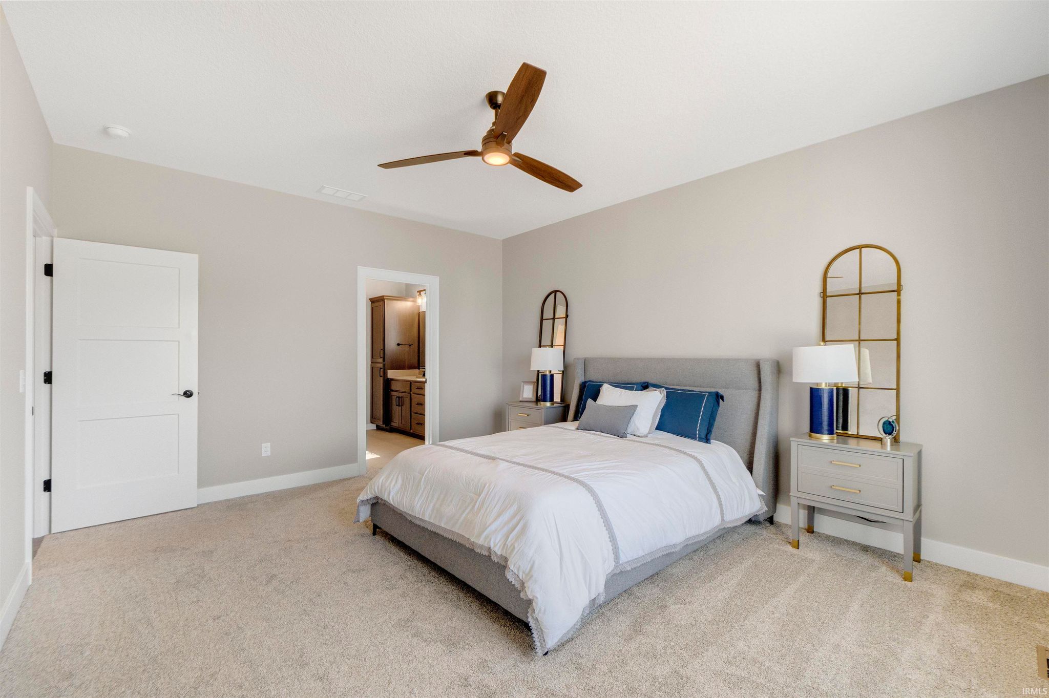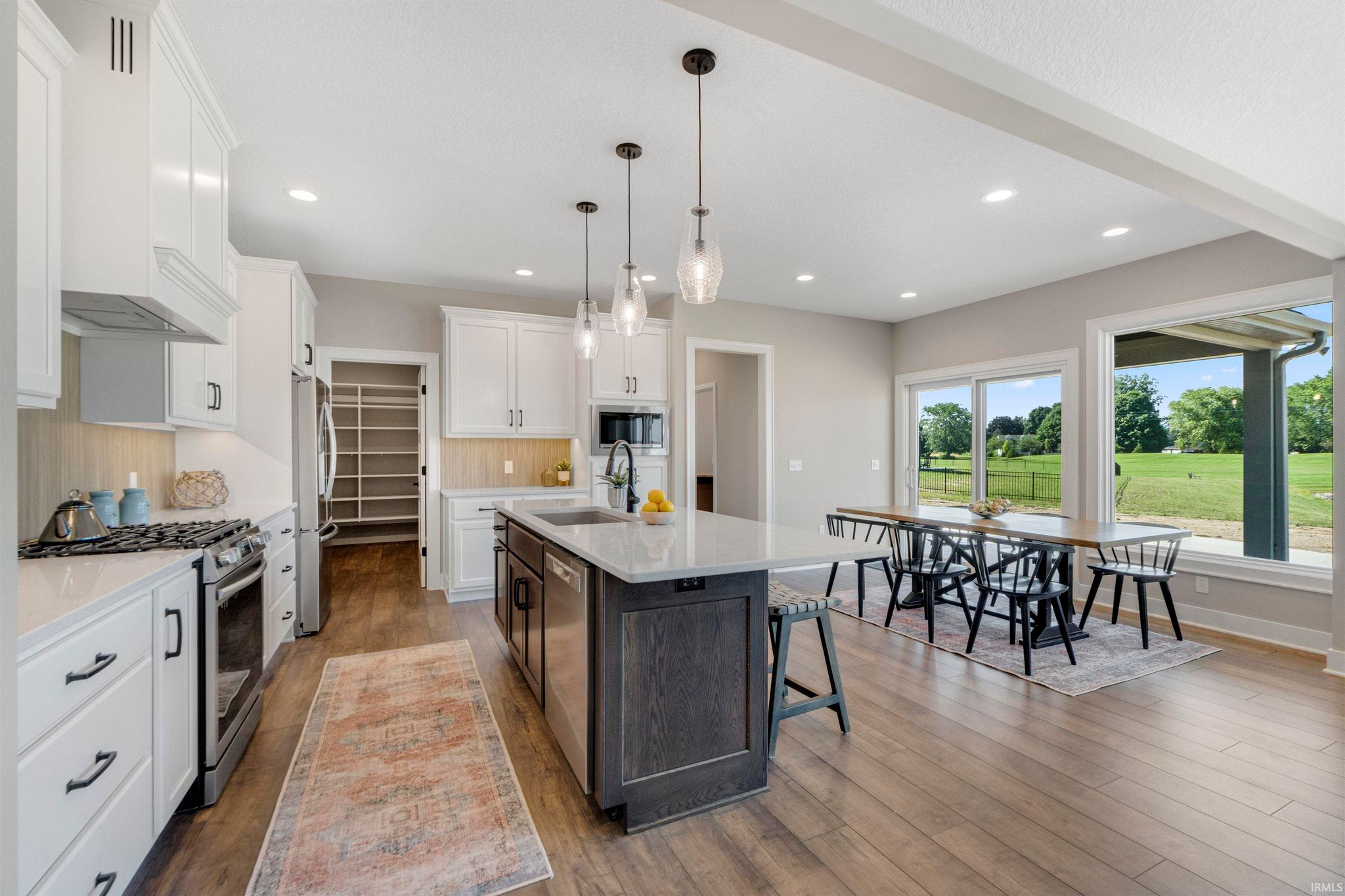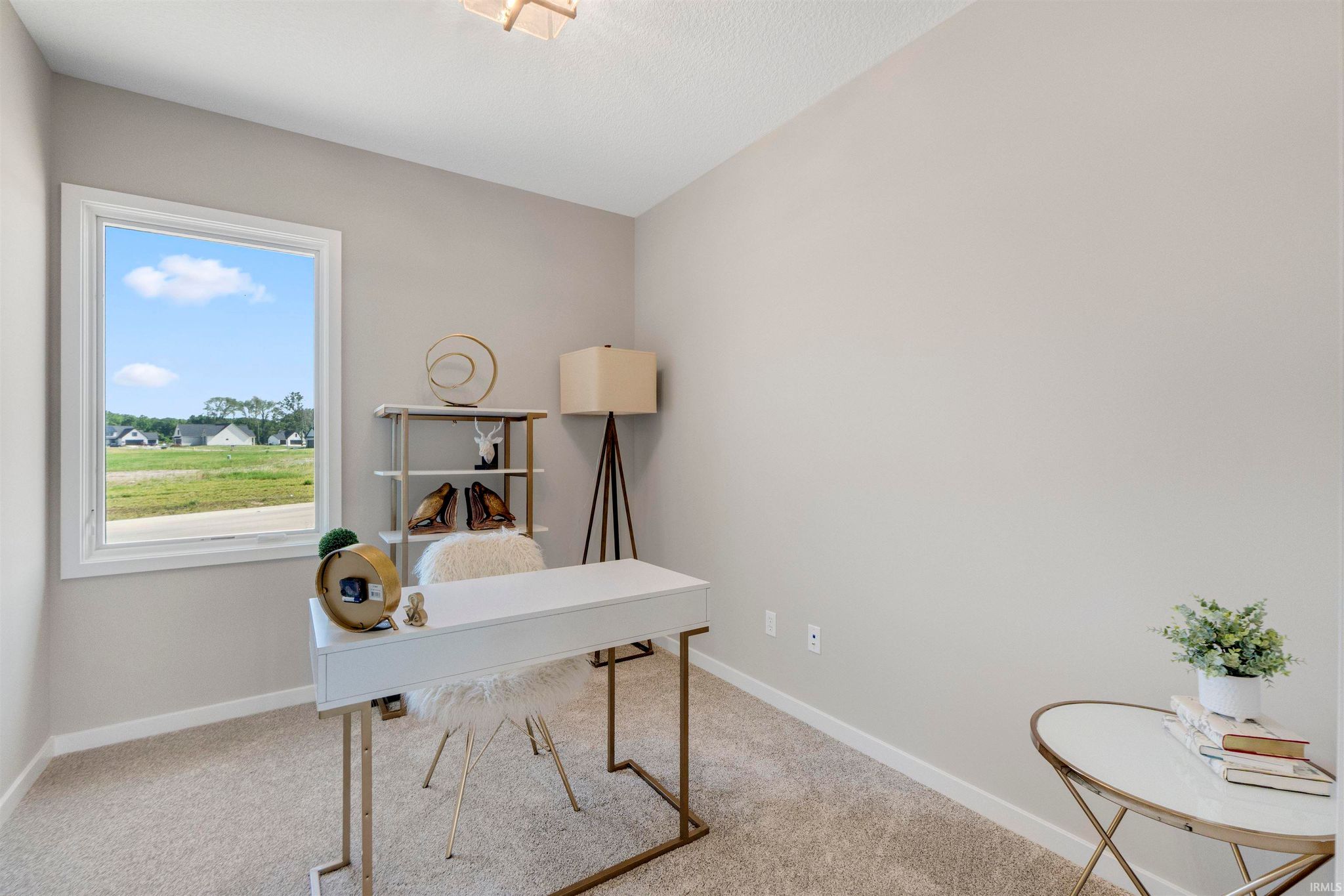Water-View Ranch by Bob Buescher Homes | Completed 2024 | Warranties Begin at Closing. Experience the opportunity to own a completed ranch with scenic pond views in Cascata Estates by one of Fort Wayne’s most recognized custom builders. Built in 2024 and treated as new construction, this home includes builder warranties beginning at closing, offering the confidence and peace of mind. Thoughtfully positioned on Lot 62 with open sight-lines toward the neighborhood pond and fountain, this 2,032 square foot single-level design offers three bedrooms, 2.5 baths, a private den, and an oversized 971 square foot three-car garage. A soaring cathedral ceiling creates an immediate sense of openness while expansive windows frame tranquil water views and fill the great room with natural light. A gas fireplace with custom built-ins anchors the space with warmth and architectural presence. The open-concept layout flows seamlessly into a thoughtfully designed kitchen showcasing custom cabinetry, quartz countertops, a generous 3x8 island, gas range, full stainless appliance package, and an impressive walk-in pantry. The dining area overlooks the water and opens directly to a covered rear porch with additional patio space, ideal for morning coffee, evening sunsets, and effortless indoor-outdoor living. The private primary suite also enjoys pond views and features a spa-inspired bath with tiled walk-in shower, updated double vanity top that now matches the secondary full bath, linen storage, and a spacious walk-in closet with built-in shelving. Two additional bedrooms are thoughtfully positioned for privacy, while the dedicated den near the foyer offers flexibility for a home office or quiet retreat. A custom built-in bench and adjacent half bath just off the garage enhance everyday functionality. Irrigation, newly seeded lawn, builder orientation prior to closing, and immediate possession provide the benefit of new construction without the extended build timeline. Cascata Estates offers convenient access to walking trails, shopping, dining, Parkview Regional Medical Center, and I-69 within a desirable north Fort Wayne community. This completed water-view ranch is ready for its first owners.