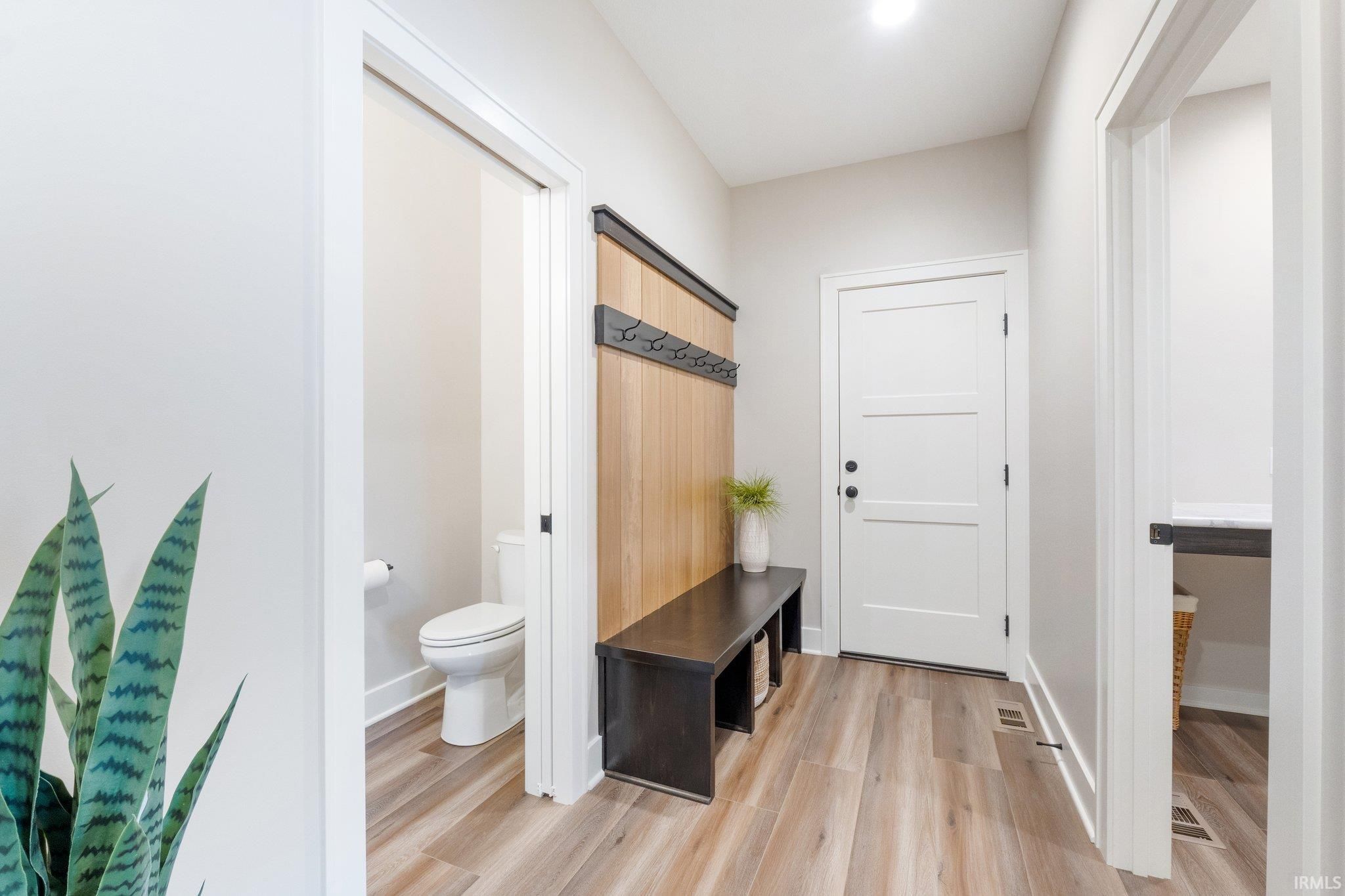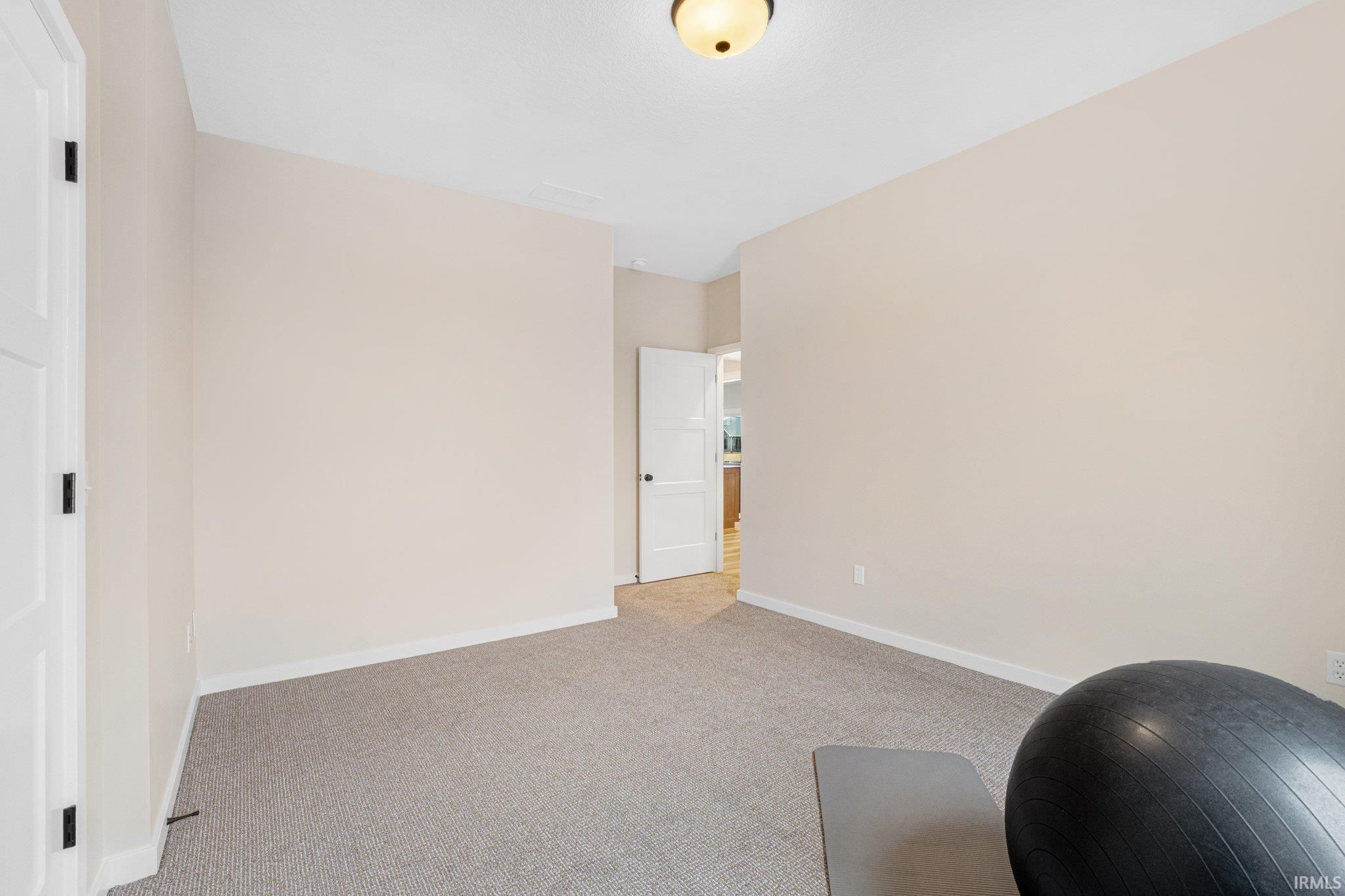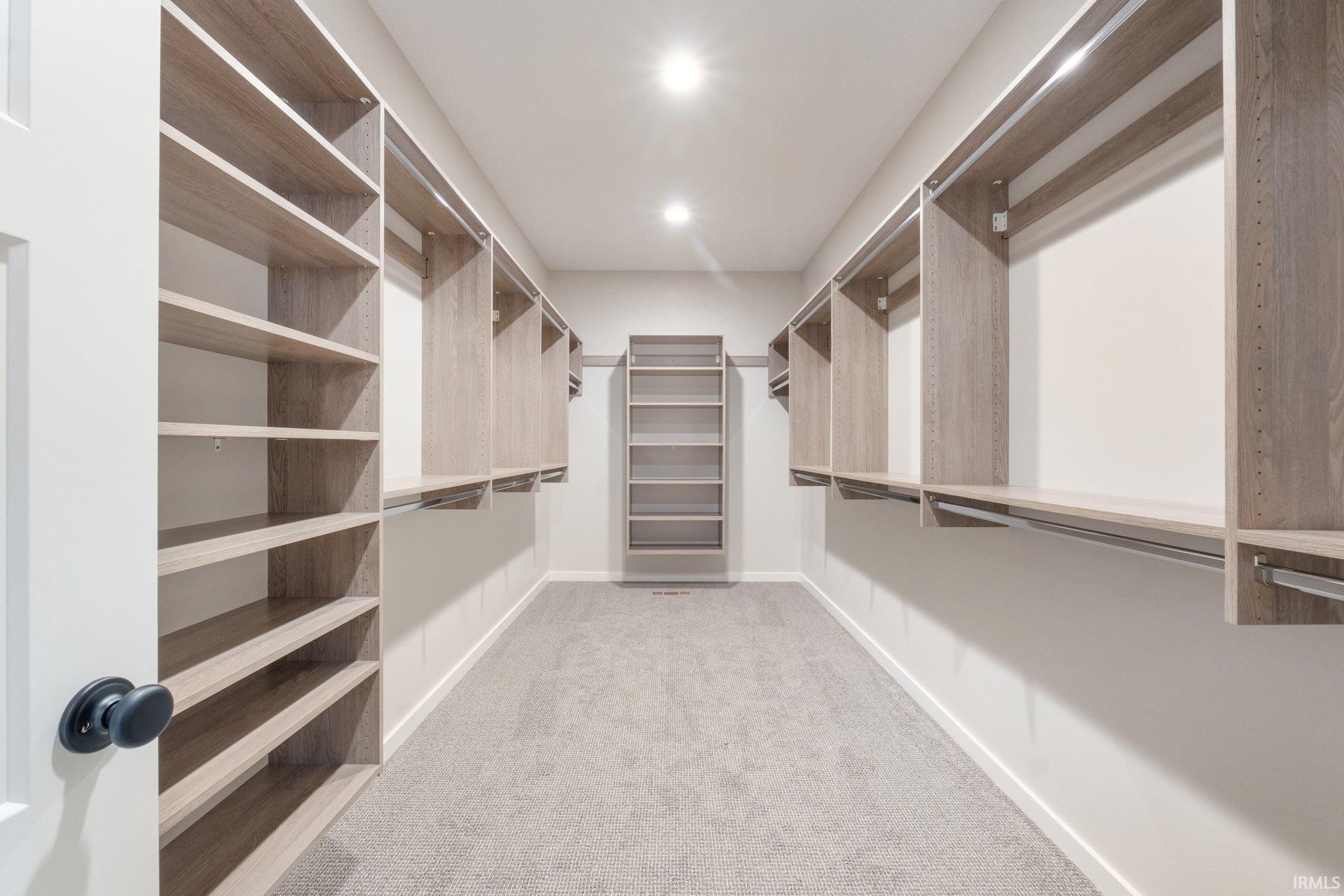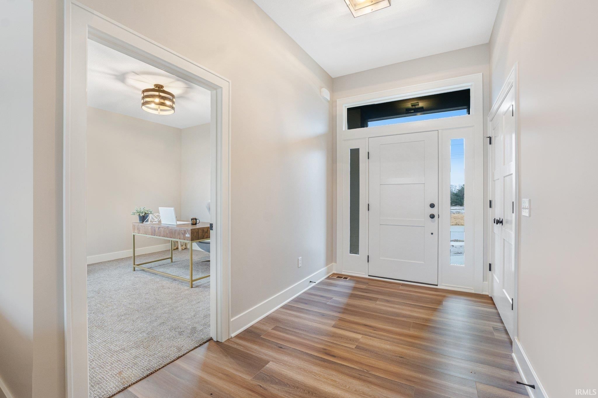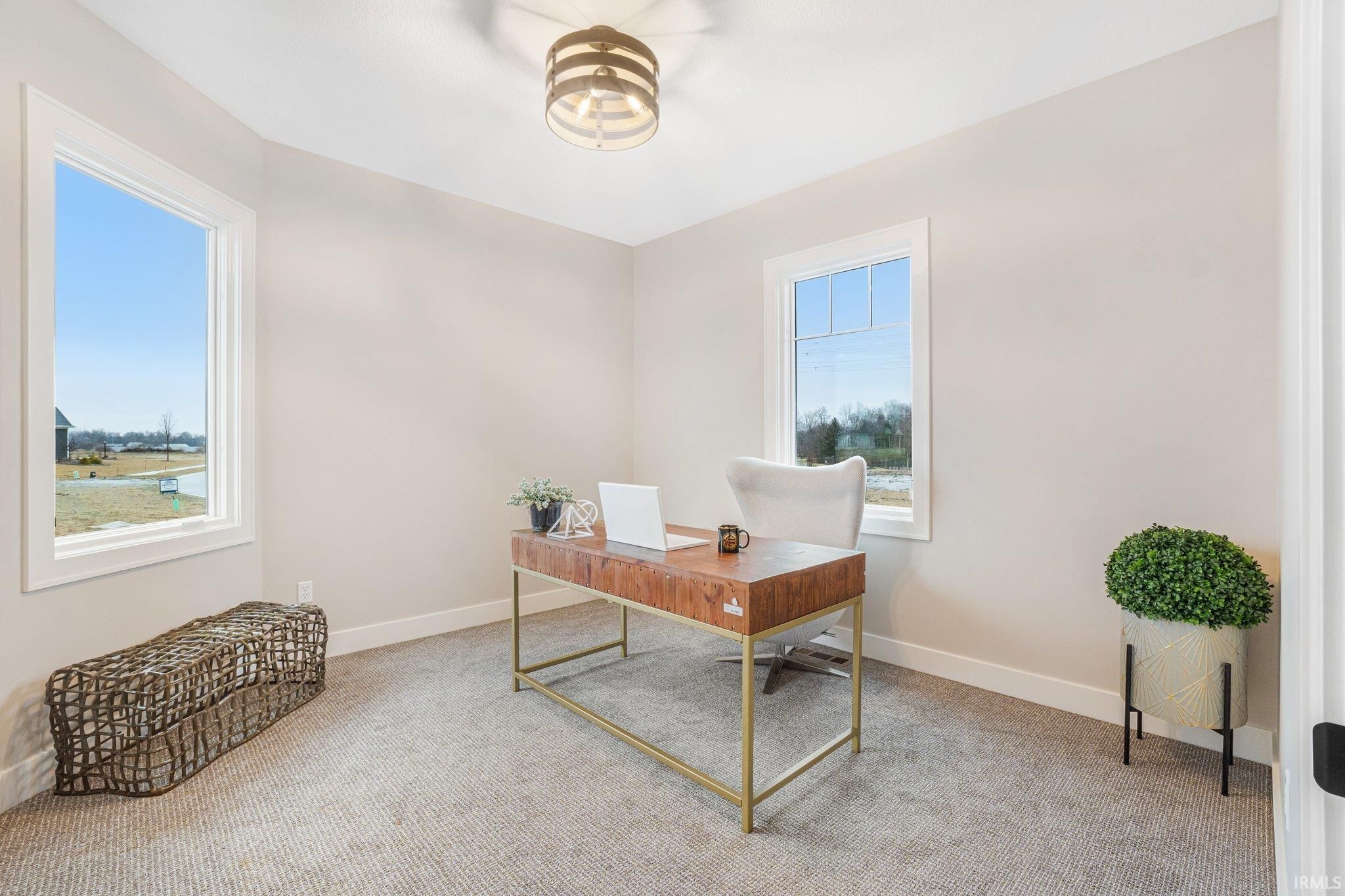 Corner Lot with Water Views | Bob Buescher Homes | Brand New | Warranties Begin at Closing. Experience the opportunity to own a completed custom home in Mercato by one of Fort Wayne’s most recognized builders. Built in 2024, this Bob Buescher Home includes builder warranties beginning at closing, offering peace of mind to its new owner. Positioned on a desirable corner lot with water views, this thoughtfully designed ranch offers 2,156 square feet of living space with three bedrooms, 2.5 baths, a den, and a 778 square foot side-load three-car garage. The open-concept layout is centered around a dramatic great room featuring a soaring cathedral ceiling and fireplace that creates both warmth and architectural presence. Expansive windows allow natural light to fill the space while connecting the interior to the surrounding views. The kitchen showcases the craftsmanship Bob Buescher Homes is known for, featuring custom white oak and elm cabinetry, a large 5x8 quartz island with MSI Midnight Carbo countertops, a gas range, and a spacious 7-foot-deep walk-in pantry. The dining area flows seamlessly into the great room, making the home ideal for both everyday living and entertaining. The primary suite is privately positioned and features a cathedral ceiling, spa-inspired bathroom with double vanity, custom tile walk-in shower, private water closet, linen closet, and an impressive 17-foot-deep walk-in closet. Two additional bedrooms provide comfortable space for family or guests, while the den near the foyer offers flexibility for a home office or quiet retreat. Outdoor living extends to a covered rear porch with an additional patio area, creating an ideal space to relax or entertain while enjoying the surrounding water views. Luxury vinyl plank flooring runs throughout the main living areas with carpet in the bedrooms. Located in the desirable Mercato community with convenient access to I-69, Lutheran Hospital, shopping, and dining, this home offers the quality and design of custom construction without the extended build timeline. Immediate possession available upon closing. This completed ranch is move-in ready and waiting for its first homeowner.